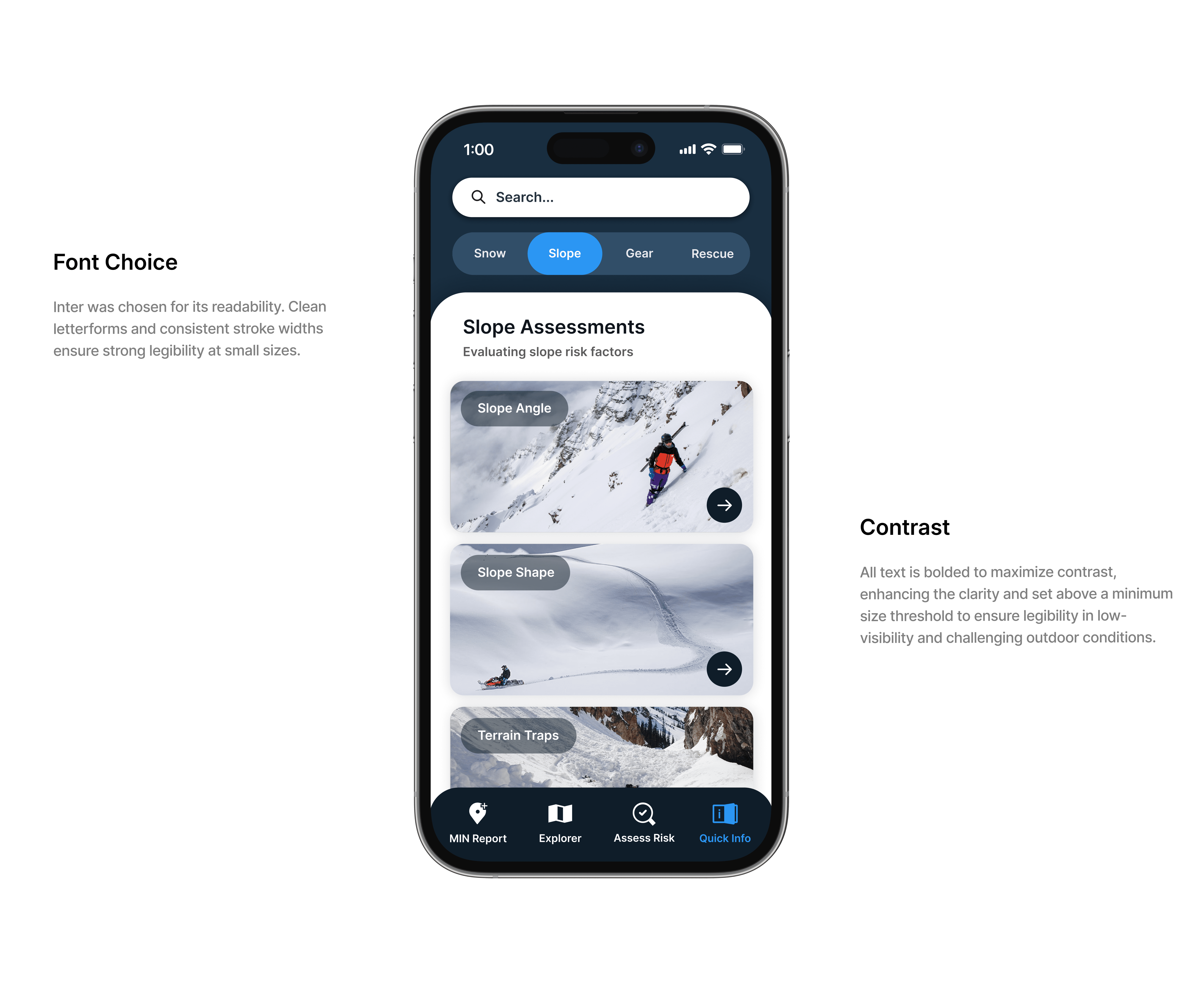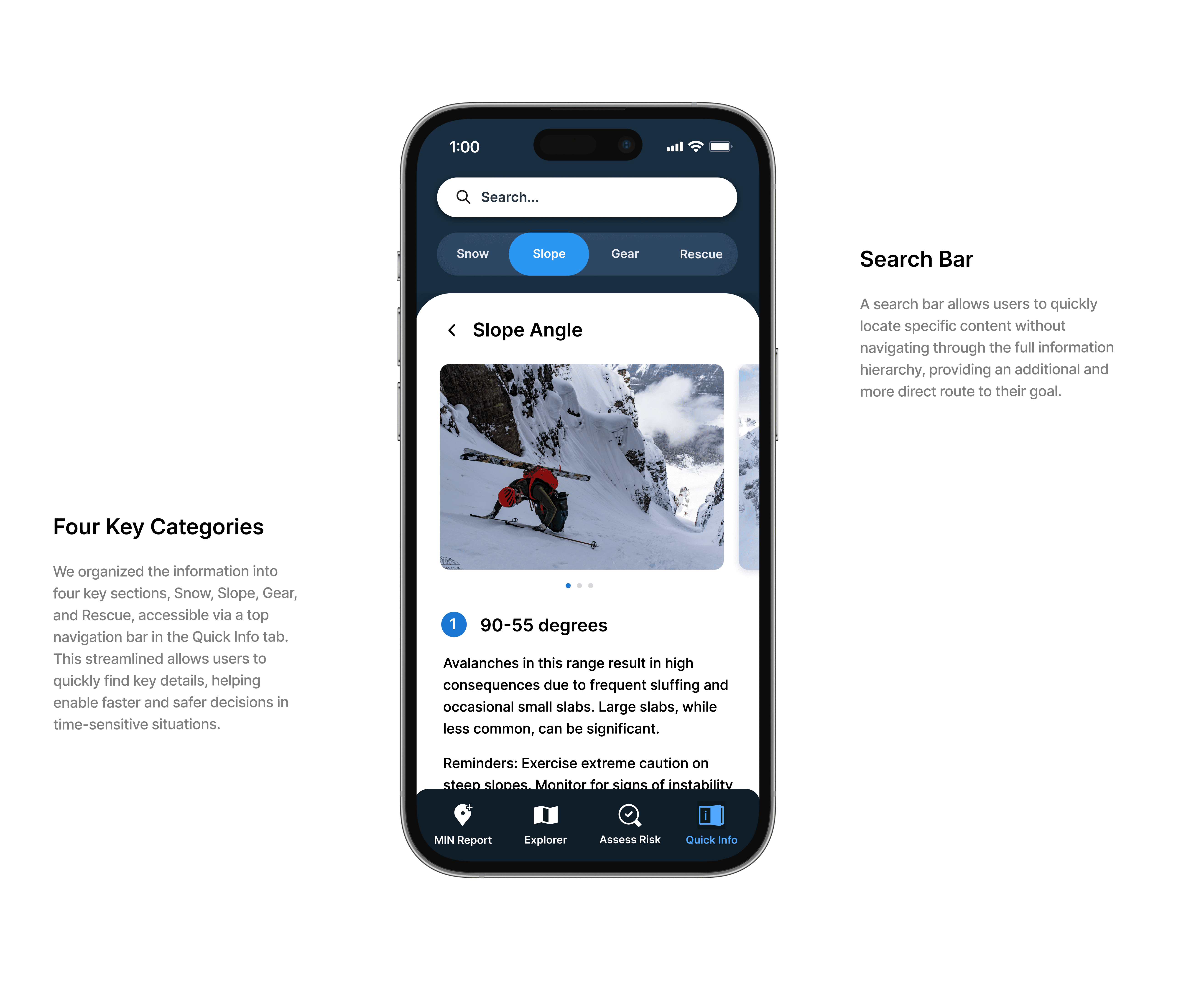 The resulting features gave inexperienced skiers something that had not previously existed within the app. Critical safety information available offline and a tool to assess slope risk on the go, both designed to support better decision making in the moments when it mattered most.