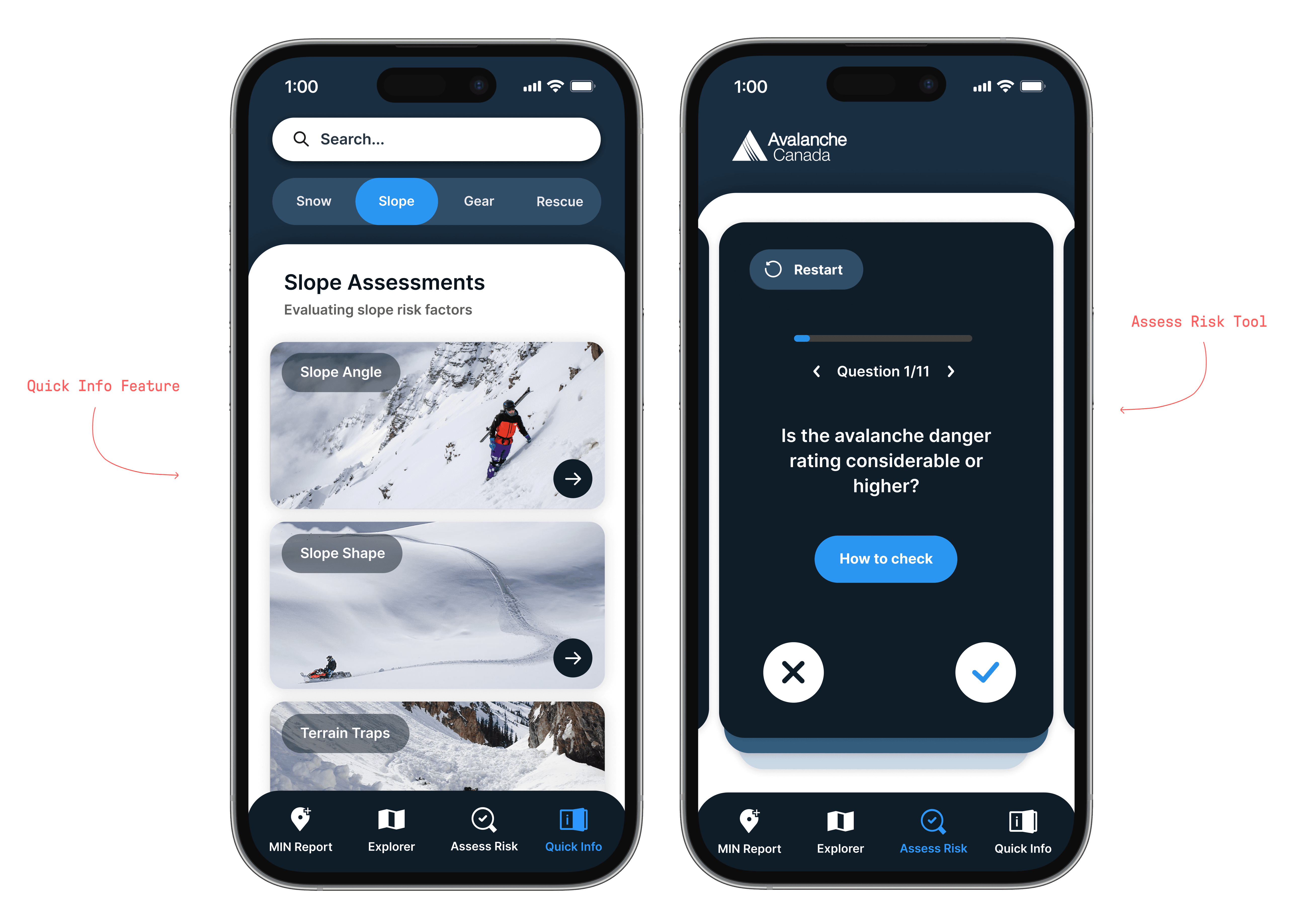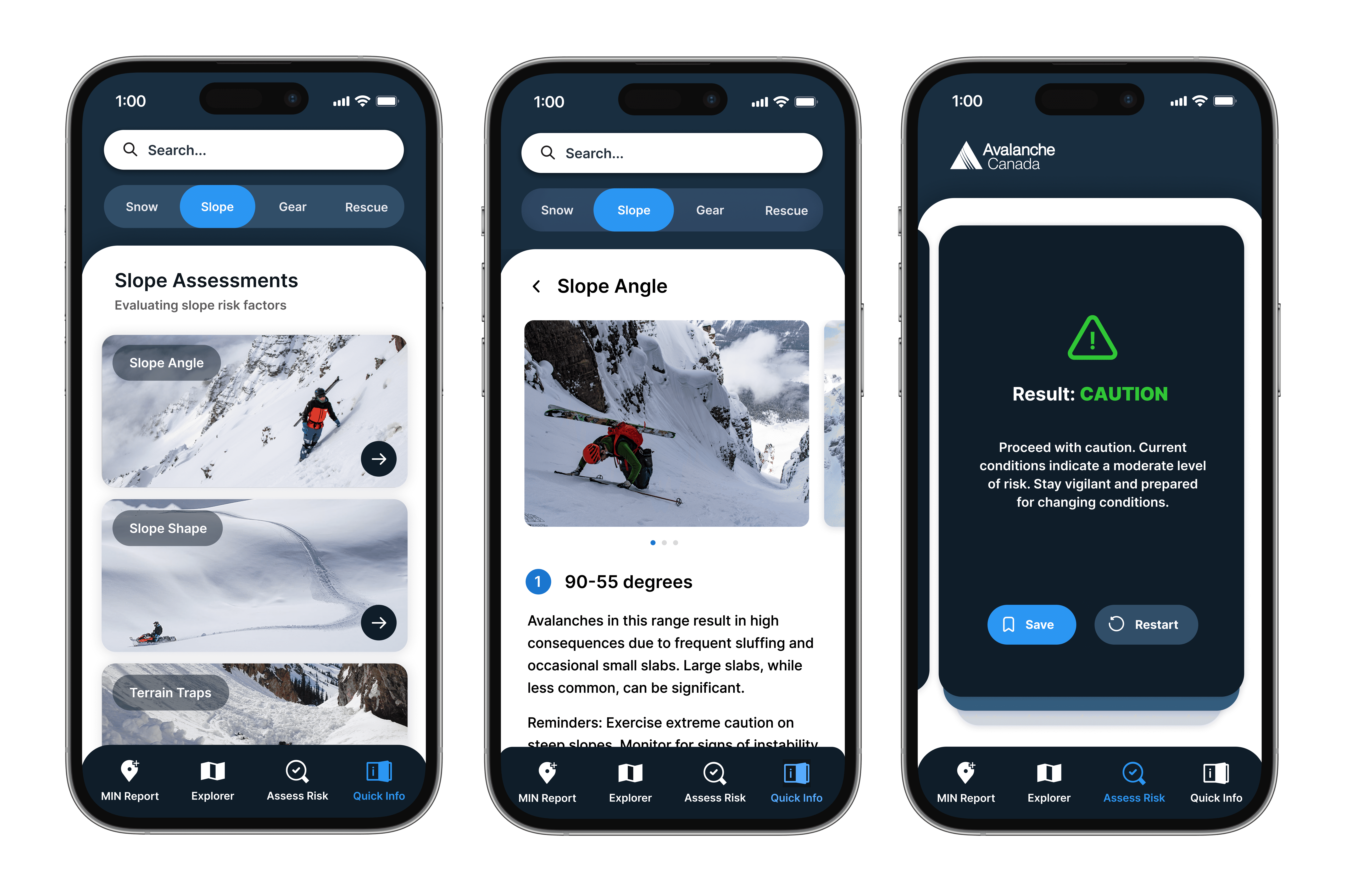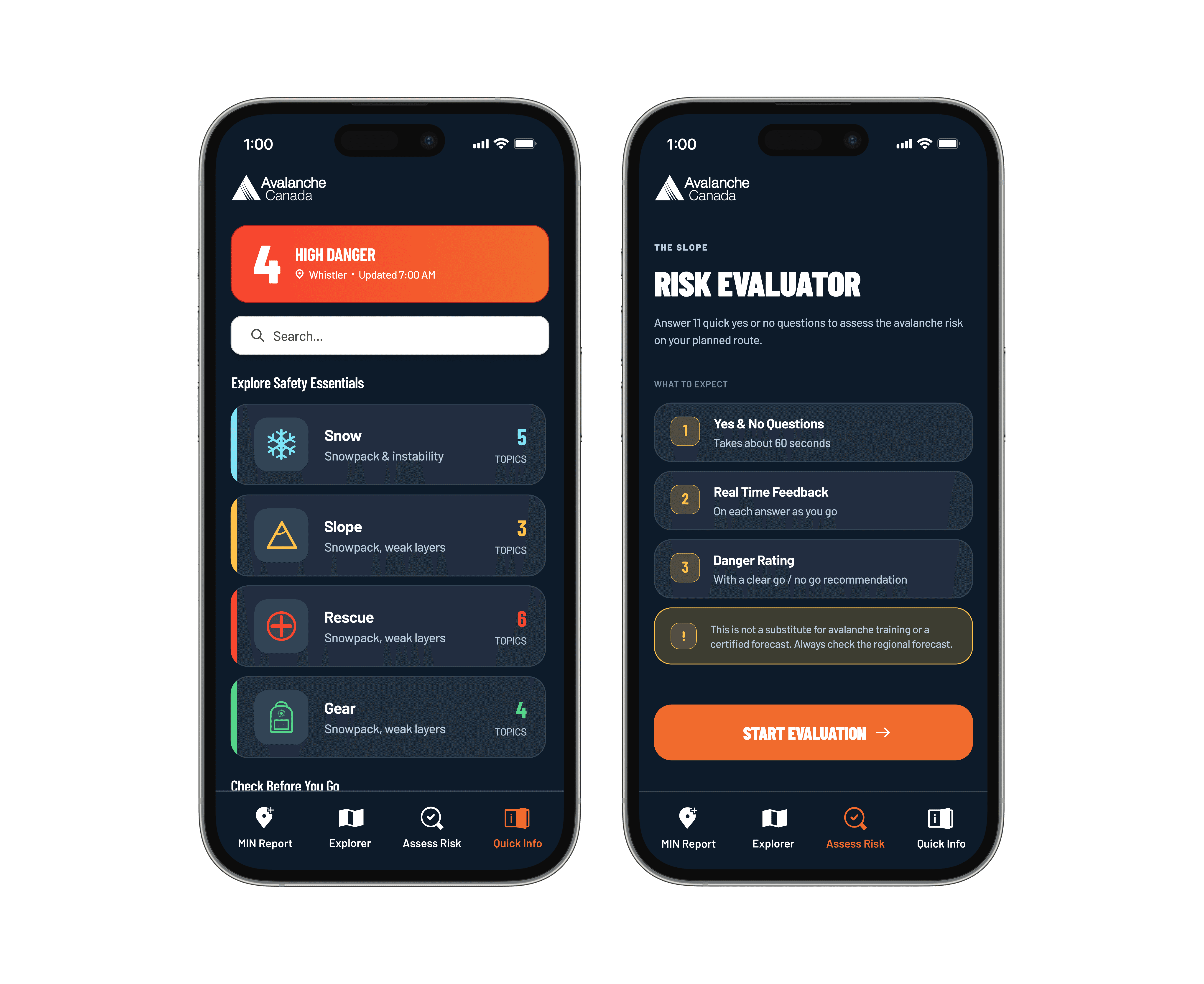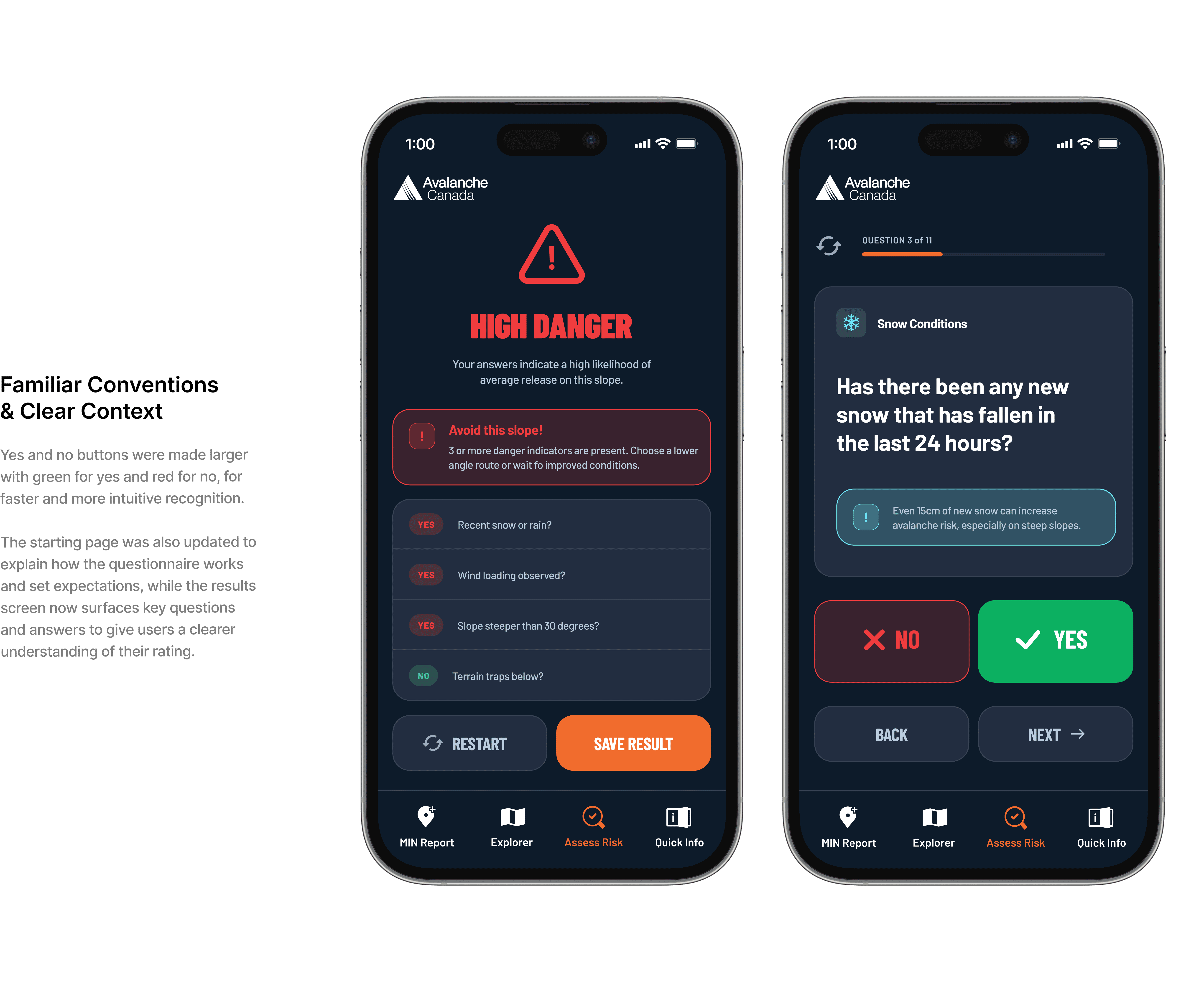 The second feature, Assess Risk, was a questionnaire tool designed to help inexperienced backcountry skiers evaluate the danger level of slopes before travelling on them. By answering a series of questions, users would receive a danger rating that they could save and refer back to for a clearer picture of the current avalanche conditions.
