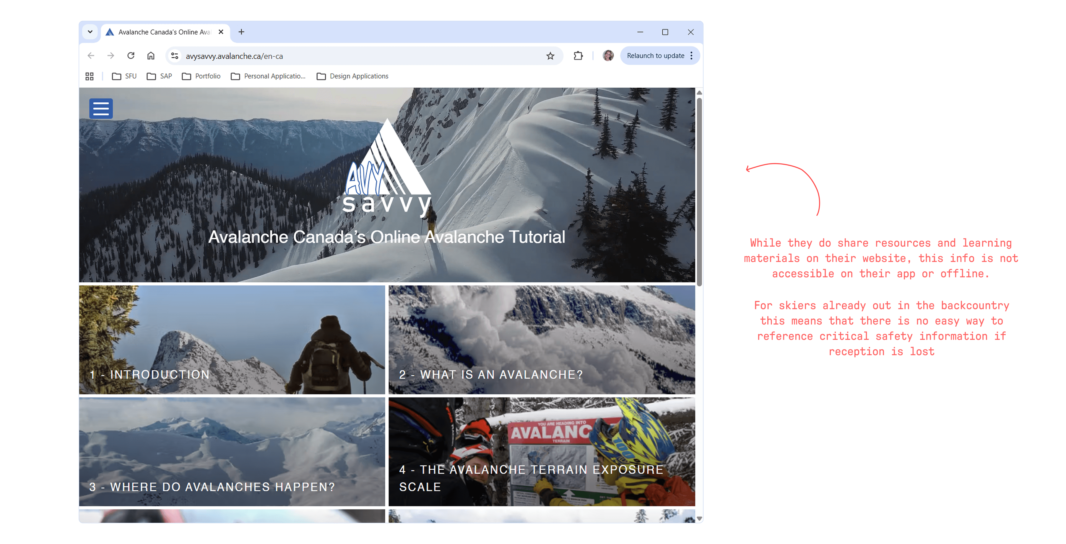 Additionally, while Avalanche Canada offers a wealth of information surrounding avalanche safety on their website, this information is solely accessible online through their website, and not included within their application, presenting a challenge for newcomers who must ensure they are well-prepared on all the details before heading out, especially in areas where reception may be lost.