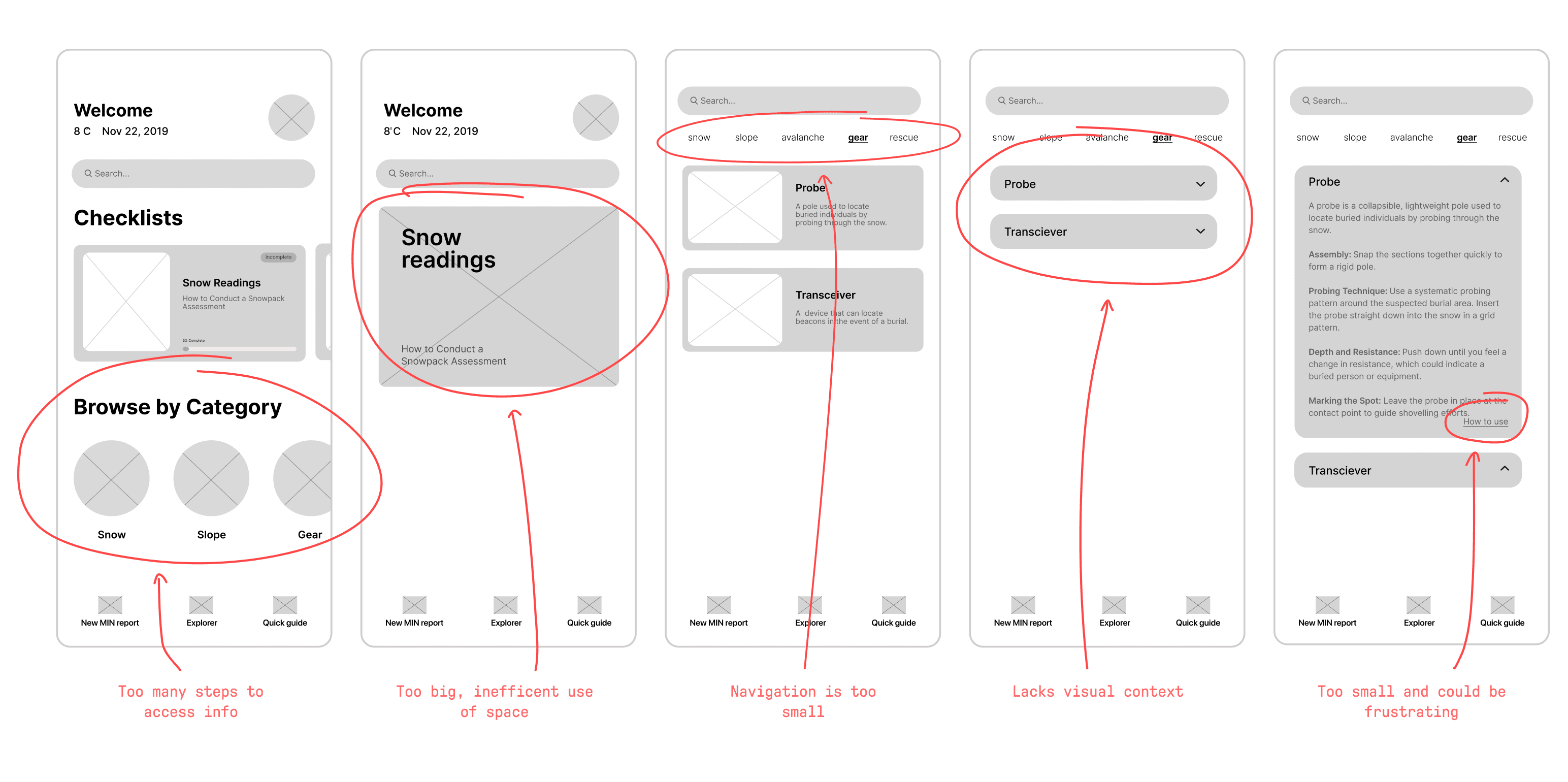 Following these key insights, we shifted our focus to the growing number of new backcountry skiers entering the sport. I conducted a series of interviews with skiers of varying experience levels, and what consistently emerged was that most struggled to learn the necessary material when first starting out, which had a direct impact on their confidence and ability to trust their judgment in the field.