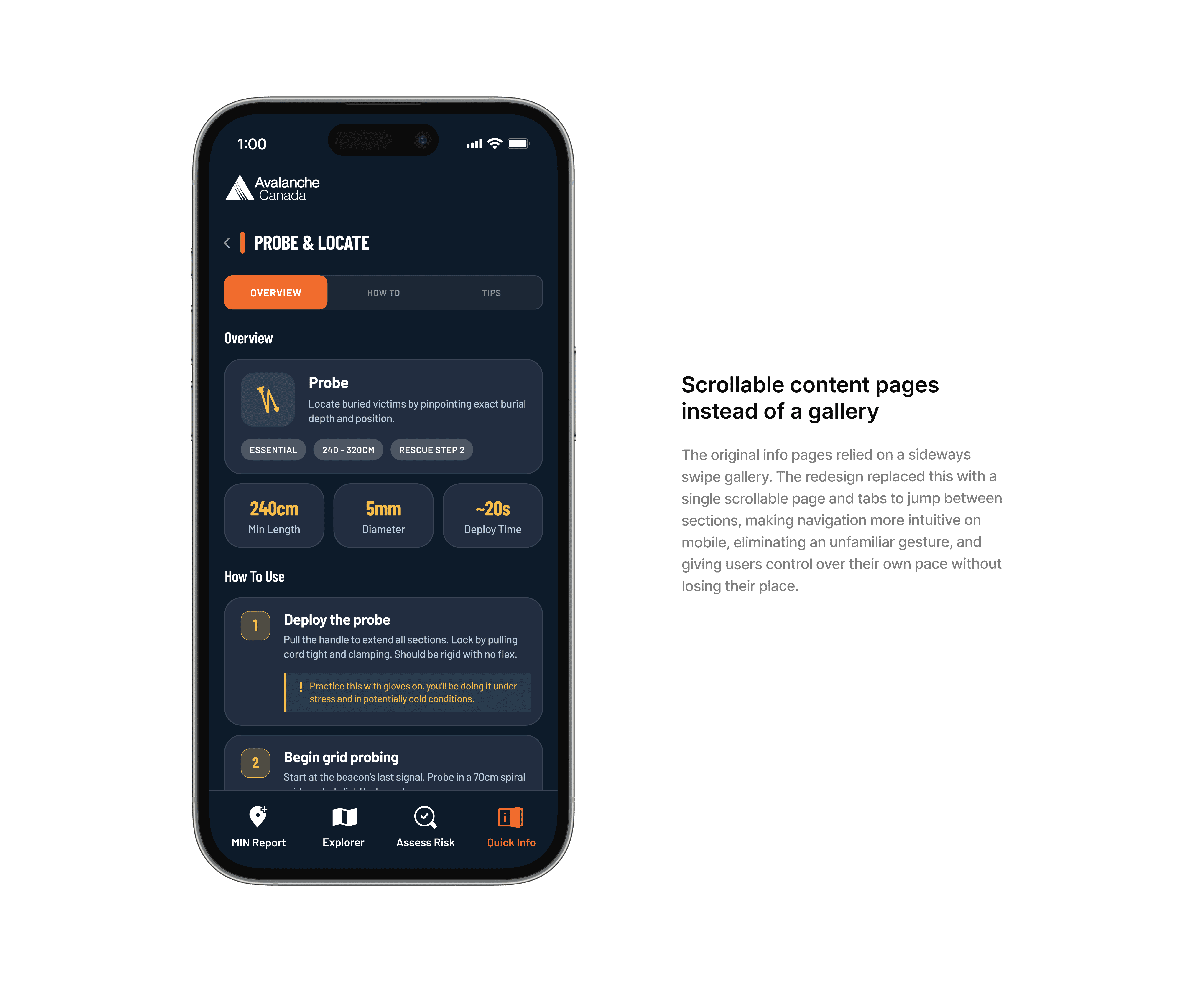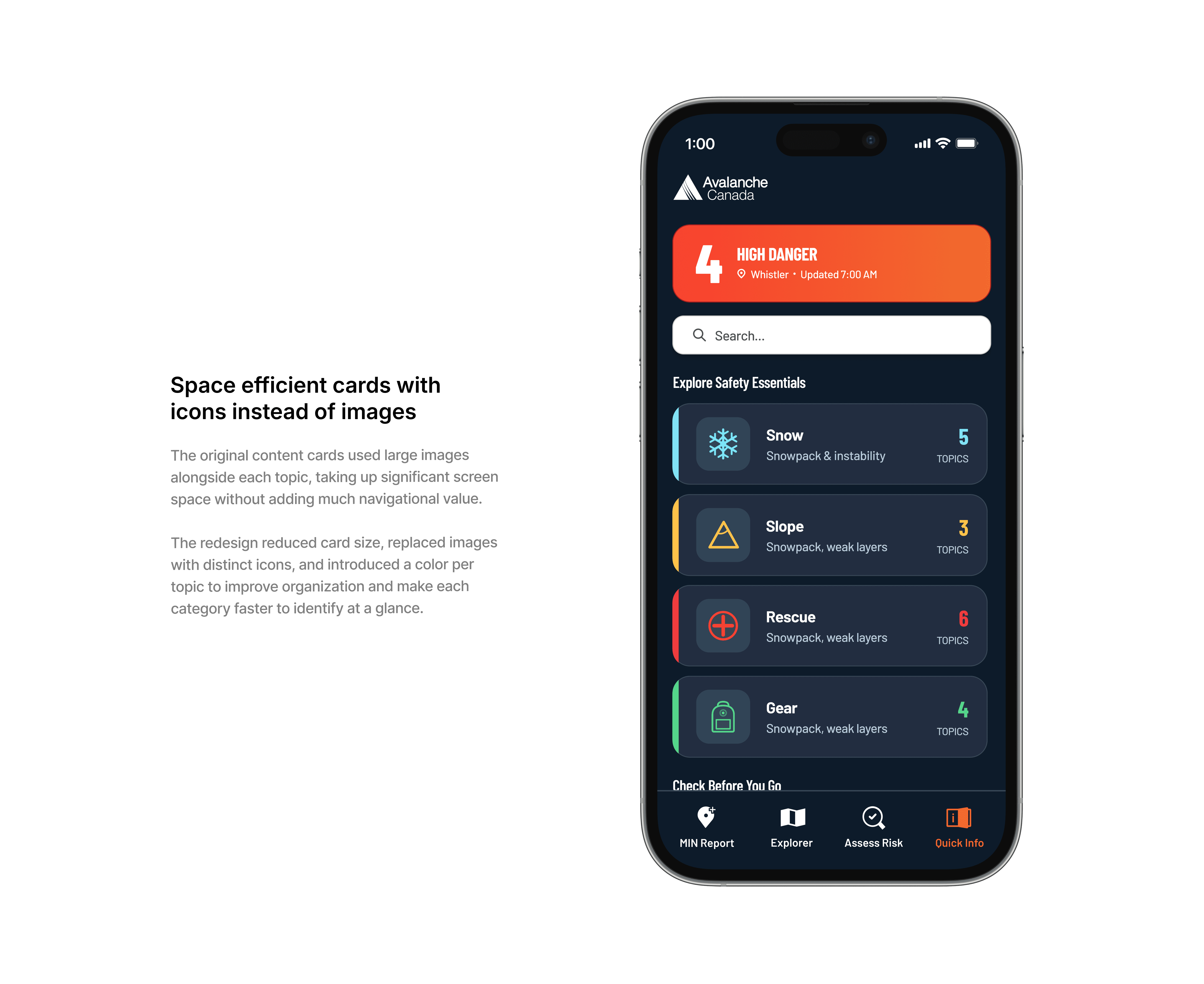 The final designs introduced two new features into Avalanche Canada's existing app: Quick Info and Assess Risk. Quick Info was designed for inexperienced backcountry skiers who are still building their knowledge, providing reliable on the go access to critical avalanche safety information needed to stay safe while out in the backcountry.
