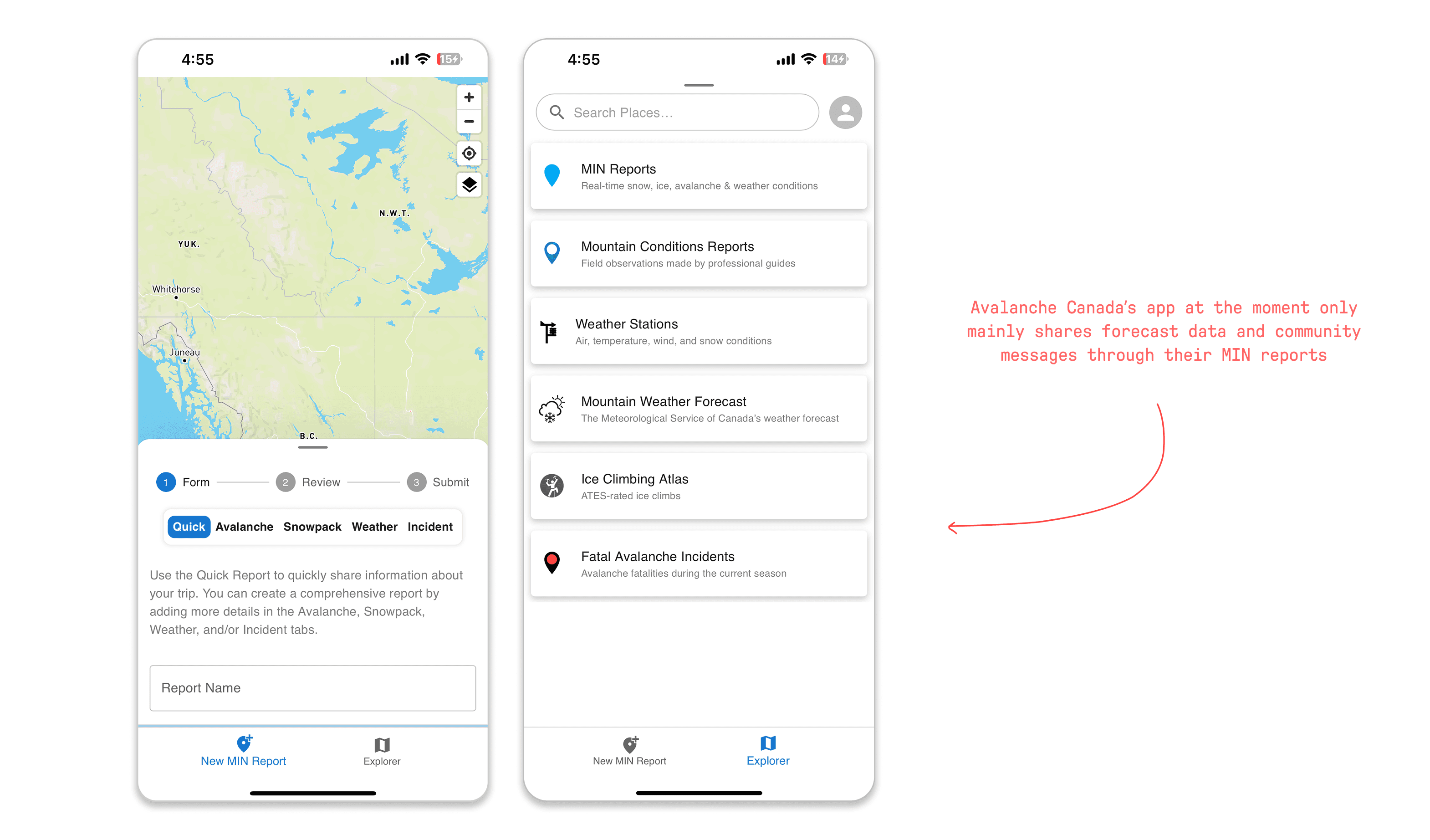 With the problem defined, our team moved into wireframing and exploring a range of concepts for how the feature could be structured within Avalanche Canada's existing app. The focus at this stage was on information architecture, and how to best structure the information so that users could find what they needed quickly and make informed decisions with confidence, even under pressure.