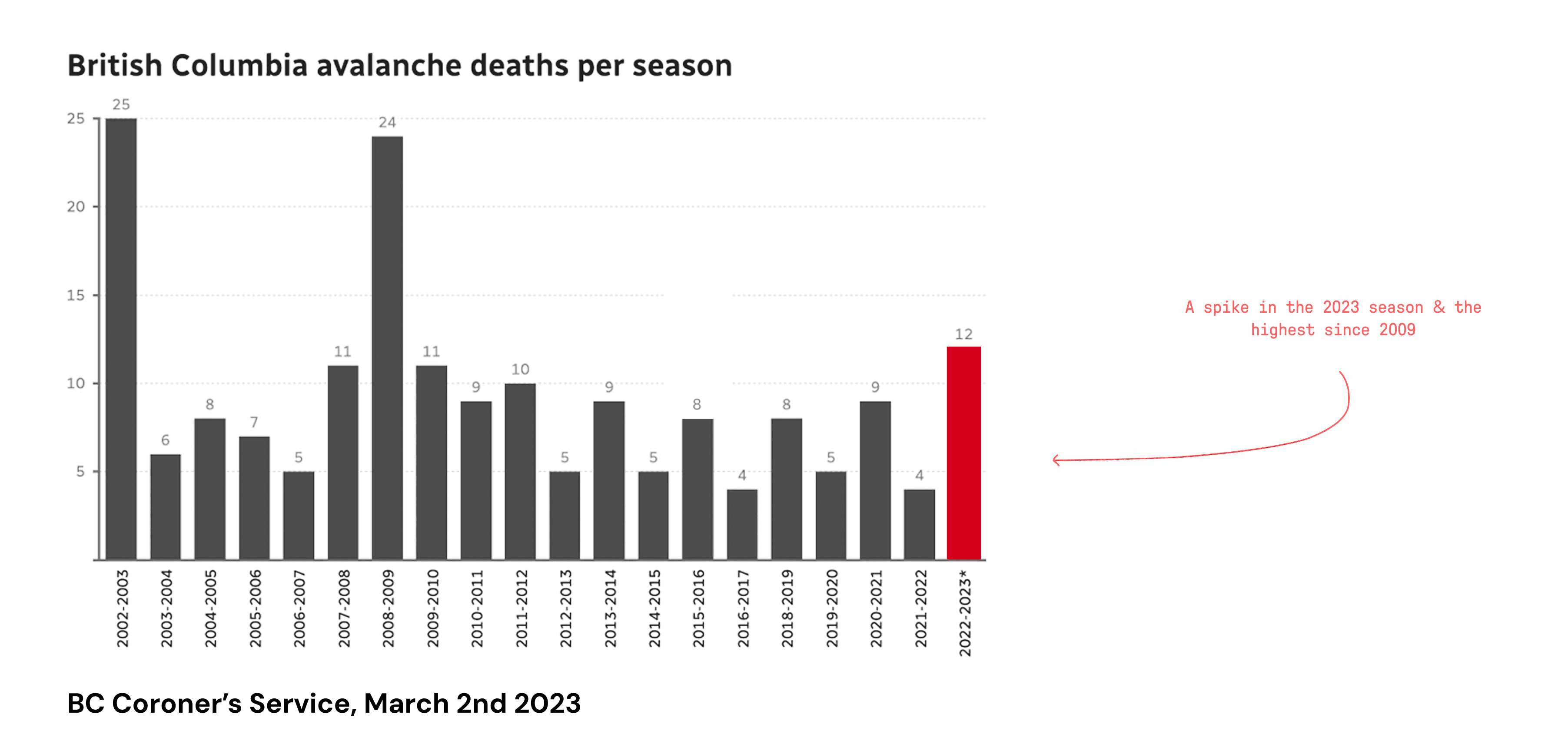 12 Avalanche related deaths recorded in the 2023 season, the highest since 2009.