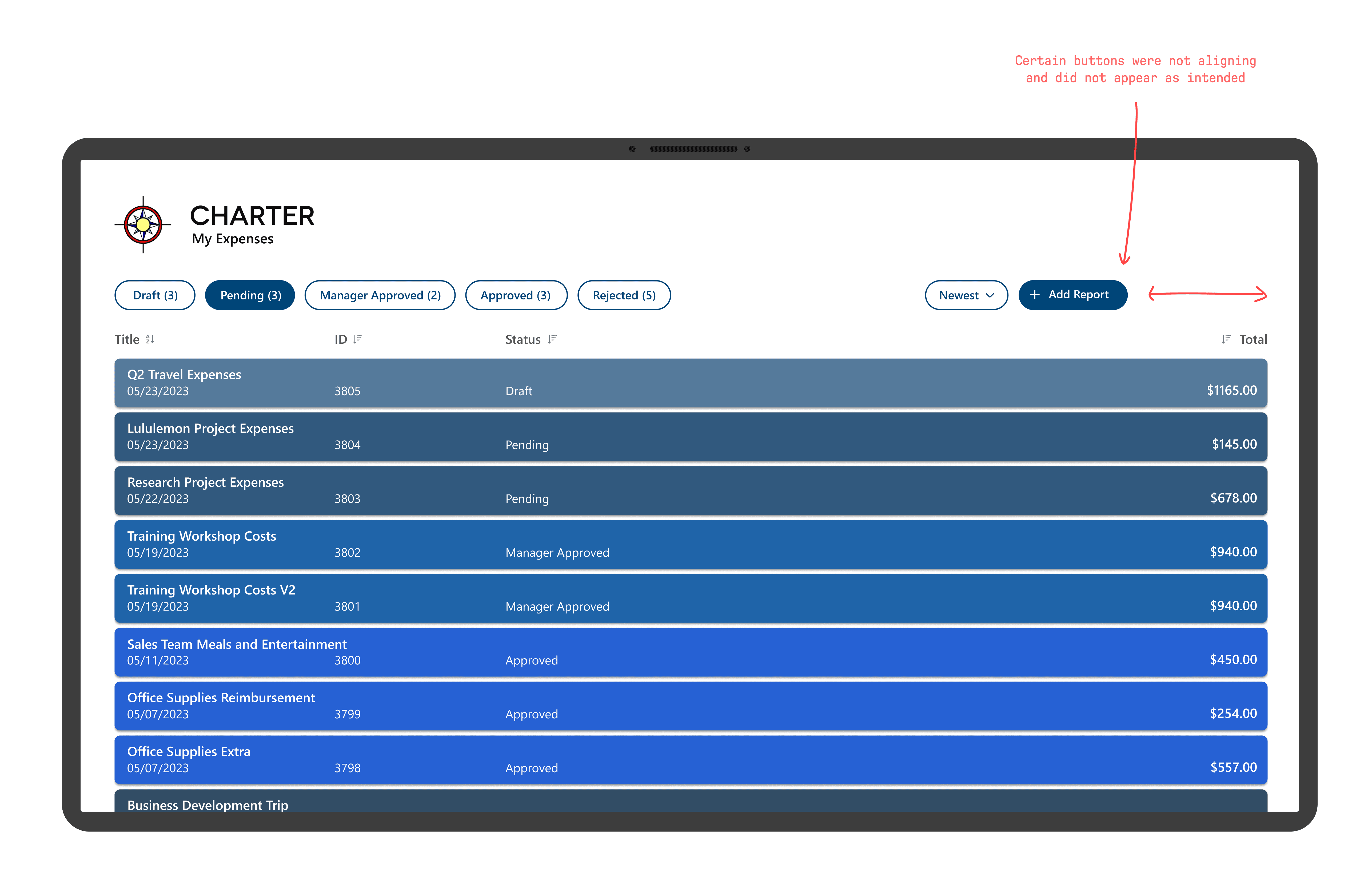 Before I joined the project, Charter’s legacy expense reporting system was nearing discontinuation and needed to be replaced, prompting the software team to begin developing a new application. I was brought on to improve the UI where possible, but early observations quickly revealed several usability issues, including inconsistent UI patterns, unclear visual hierarchy, and more.